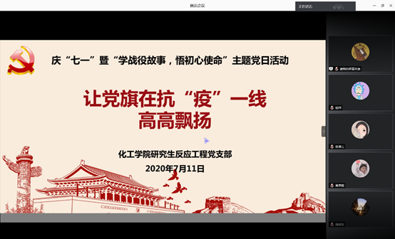 2020年7月11日,研究生反应工程党支部通过腾讯会议开展“学战疫故事,悟初心使命”主题党日,此次活动的主题为“让党旗在抗‘疫’一线高高飘扬”,旨在汇集战疫优秀故事、学习先锋模范作用、激励党员不断奋进。