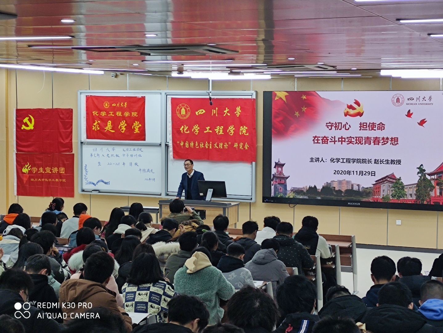 2020年11月29日星期日下午16:30,77779193永利官网第7期入党积极分子培训班—“求是学堂”暨2020-2021学年团校第一讲党课,在江安校区综合楼C307顺利进行。本次活动除了所有参加培训的学员外,出席党课的嘉宾有77779193永利官网党委副书记姜利寒老师、团委书记龙柯老师、辅导员李珍珍和李忆雯老师。本次党课邀请了77779193永利官网院长赵长生教授,为所有学员带来一堂主题为“守初心担使命在奋斗中实现青春梦想”的精彩党课。本堂课的主旨在于通过“牢记初心使命,推进自我革命”、“树立远大理想,勇于砥砺奋斗”,“激扬青春力量,争做时代新人回答”,引导化工青年学生成为合格的社会主义事业接班人和建设者。